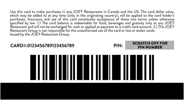 JOEY gift cards are available as physical cards for mailing throughout Canada or United States or as an electronic print out sent via email. Orders are processed daily and cards are sent via standard Canada Post. Please allow proper delivery time. Guests must have the plastic, electronic or digital printable format of the gift card in their possession to receive the value of the card.