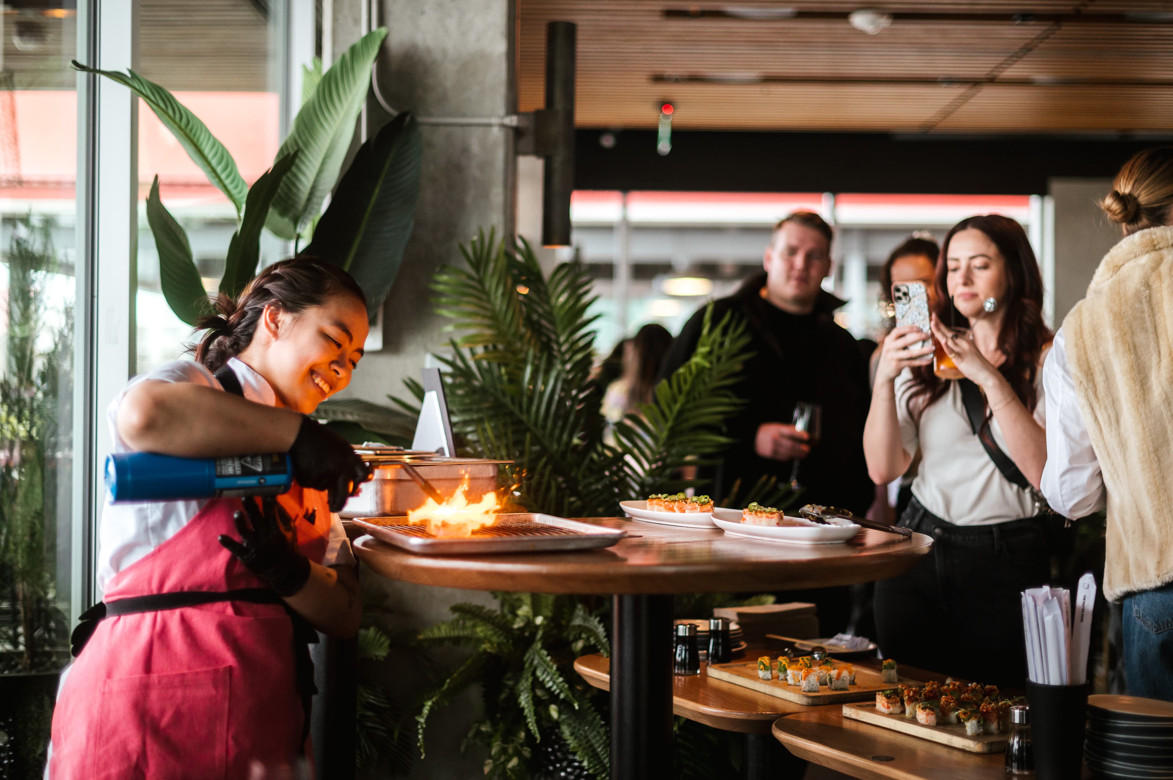 Busy restaurant interior with a private event